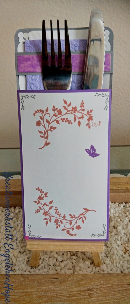 Vorne habe ich Farbkarton in Heideblüte, Flüsterweiß und der schmale Streifen hinter dem Besteck ist in Schiefergrau mit einem Lila Marmorierten Aufleger.