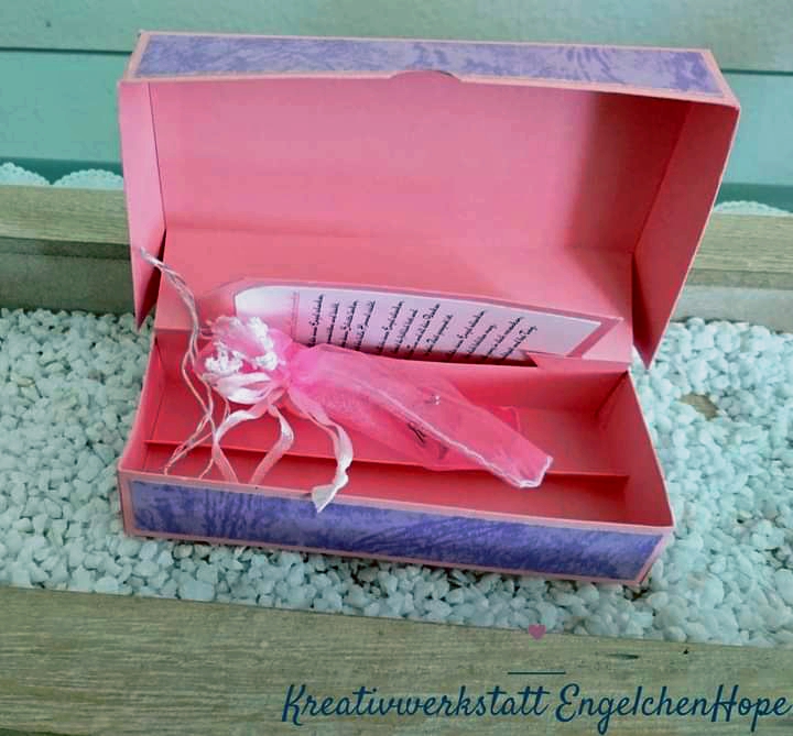 Nach den Gastgeschenken für die Herren kamen nun auch die Damen an die Reihe, genau wie bei den Herren wo ich die Anregung zu dieser Box bei Pinterest gefunden, wo auch Anleitung von Franziska Klimek von Stempeleinmaleins dabei ist.