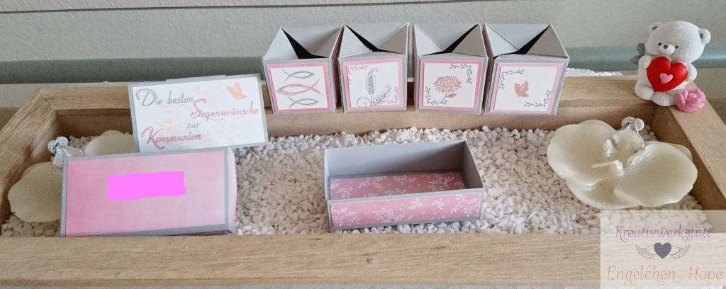 Ich sollte im Auftrag von einer Kundin was Besonderes zur Kommunion eines Mädchens gestalten, da sie nicht wusste was habe ich Ihr das Video von den Springwürfel, die ich für meinem Verlobten gewerkelt hatte, gezeigt.
