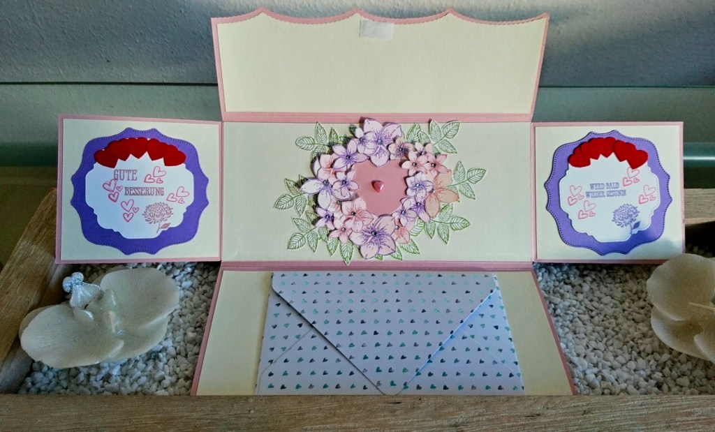 Ich hatte von einer lieben Kundin einen Auftrag für eine Gute Besserung Karte bekommen, Sie wollte die mit Blumen, Herzen und in der Farbe Vanille haben.