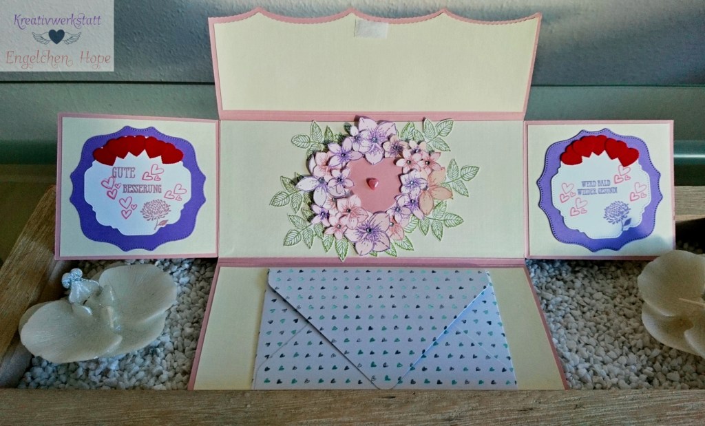 Da ich aber nur dünnen Farbkarton in Vanille hatte, habe ich die Grundkarte in Kirschblüte gemacht und dann den dünnen Vanillefarbigen Farbkarton innen verwendet.