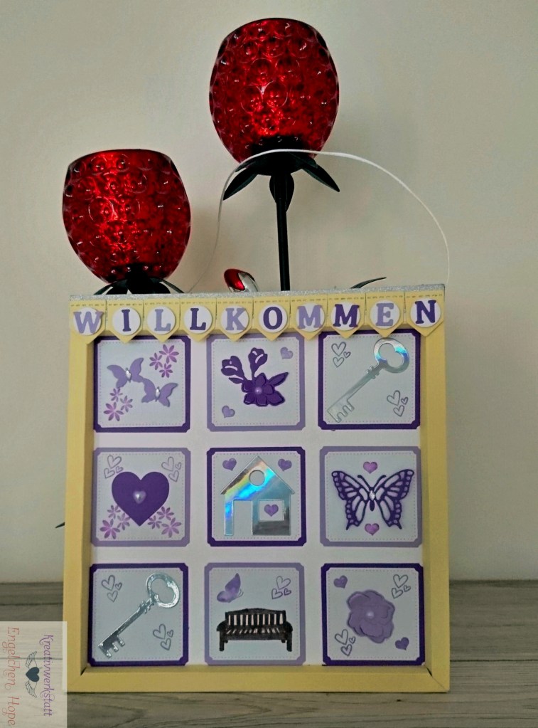 Ich wollte meiner Schwester mal ein Willkommen Bilderrahmen für die Haustür machen und fragte sie welche Farbe sie mag, da sagte sie mir das ihre Lieblingsfarbe Lila ist.