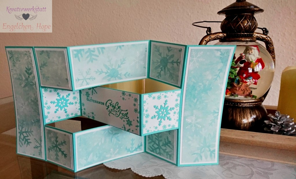 Da ich keine einfache Karte sondern eine besondere Karte in die Box legen wollte, habe ich bei Pinterest eine Zickzack Karte von Ilka Specht von Basteln an der Elbe gefunden und musste sie einfach nachbasteln.
