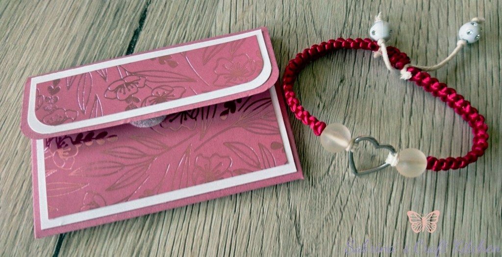Die Beschenkte sollte ein Armband mit Herz und Perlen in Makramee-Technik bekommen verpackt in einer Geschenkbox mit einer Karte dazu.