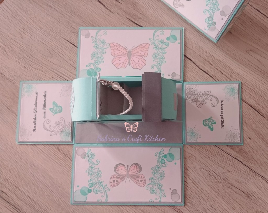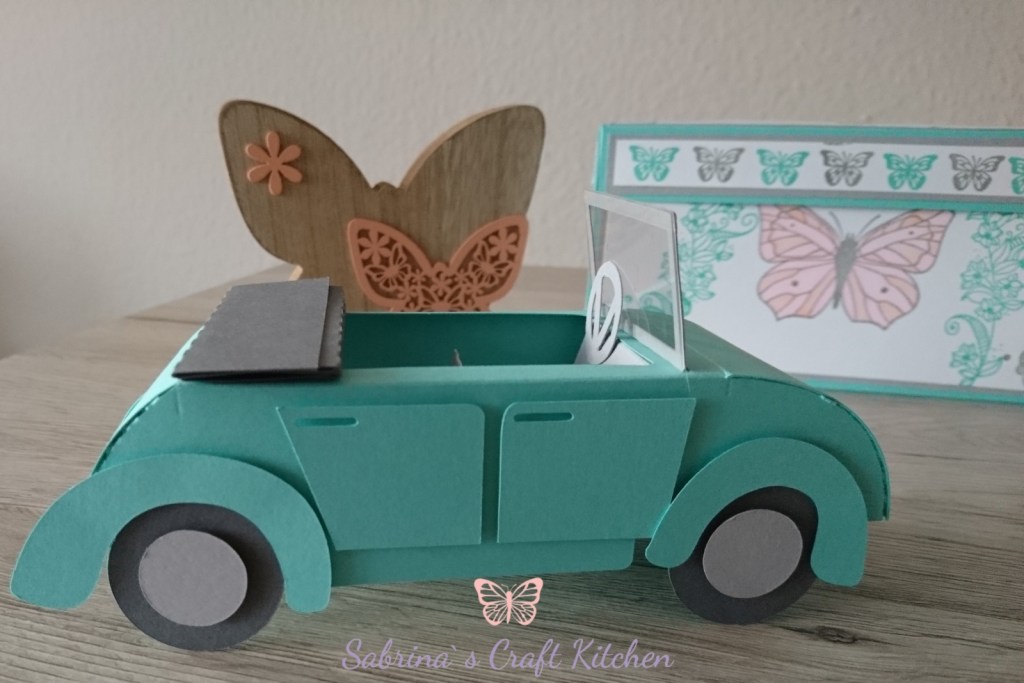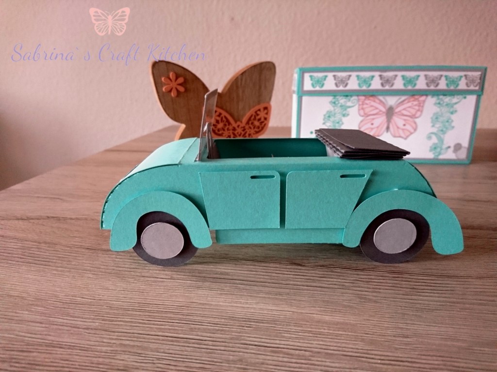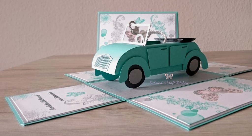 So ist eine Explosionsbox von meinem Basteltisch gehüpft mit einem Auto als Cabrio und einem Schlüsselanhänger in Makramee Technik mit Schutzengel.