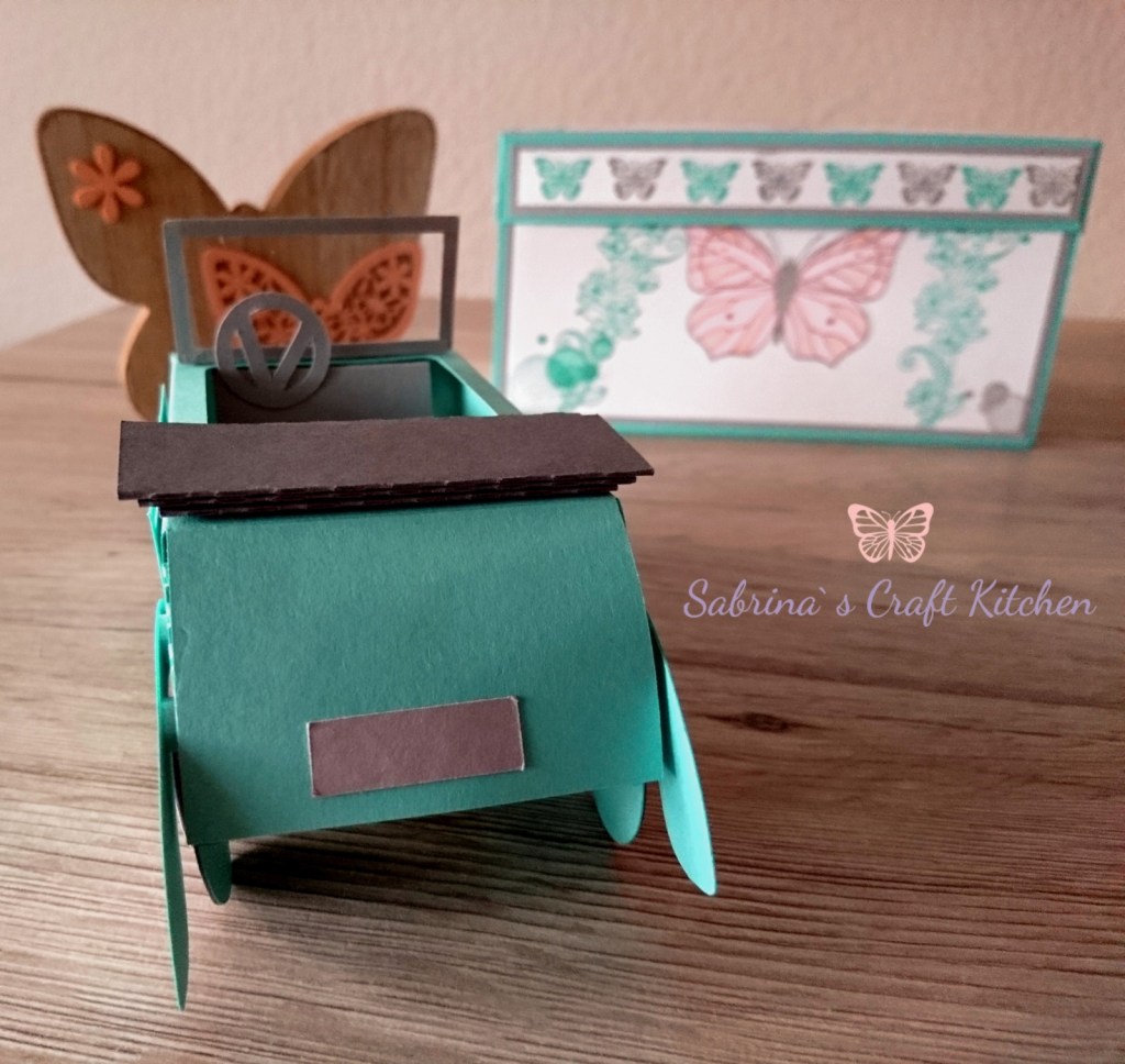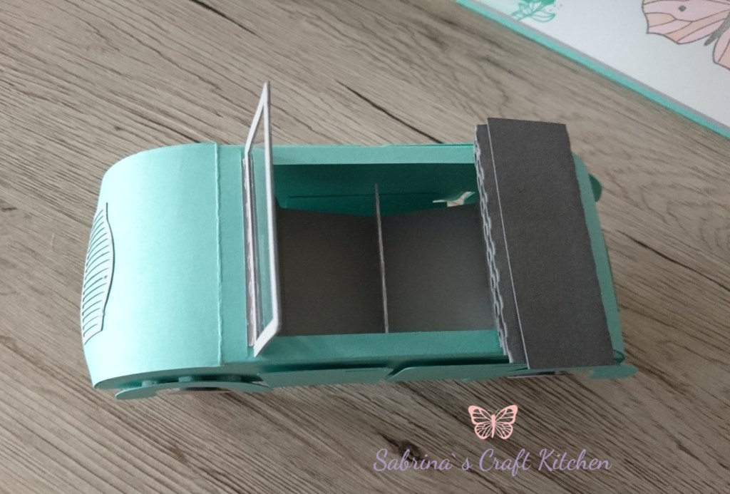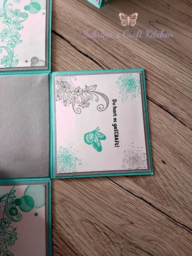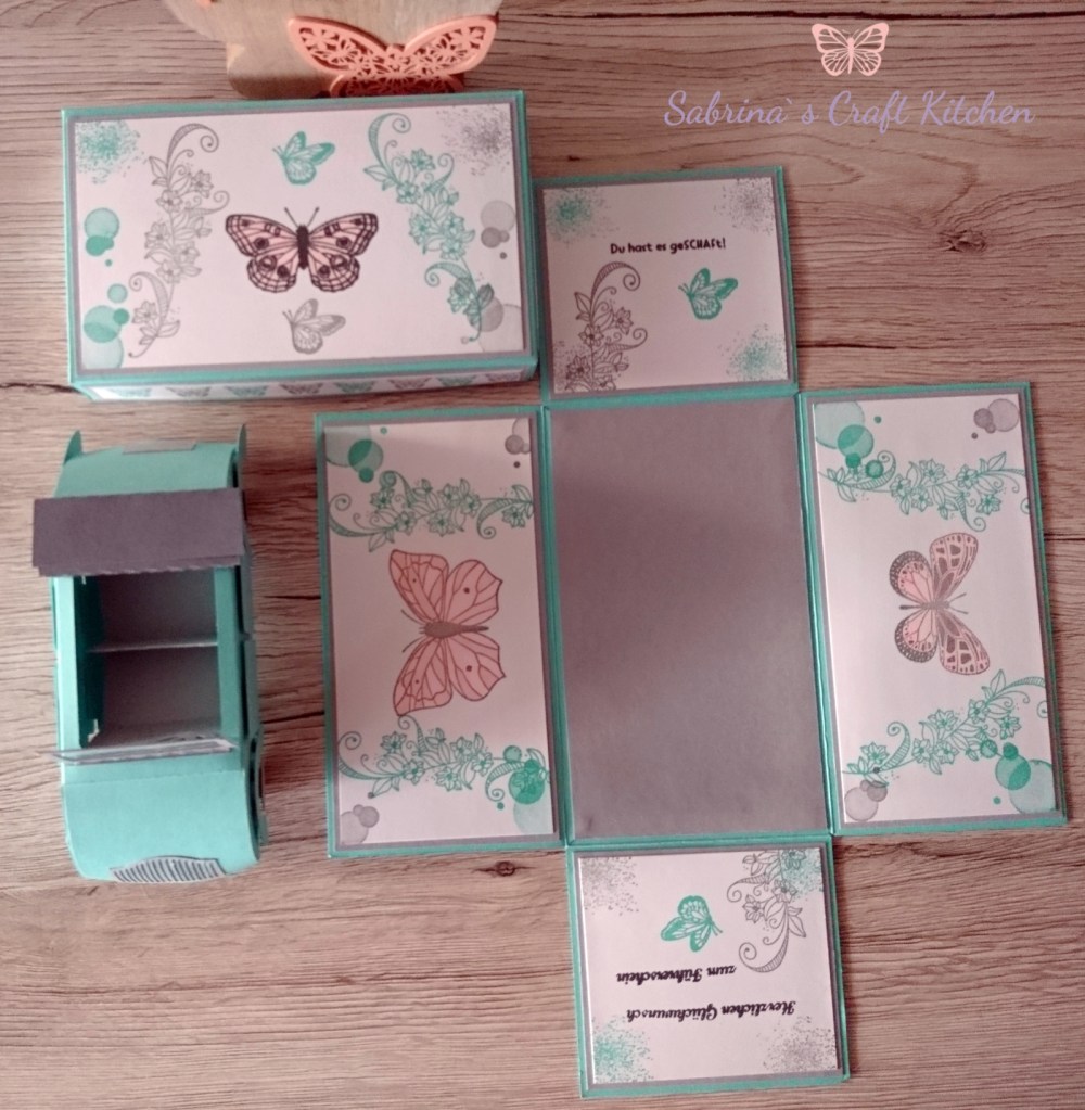 So ist eine Explosionsbox von meinem Basteltisch gehüpft mit einem Auto als Cabrio und einem Schlüsselanhänger in Makramee Technik mit Schutzengel.