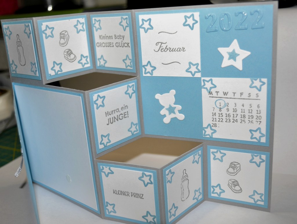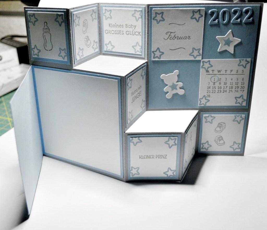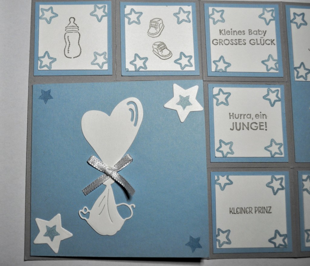Ich habe die Grundkarte mit Farbkarton Schiefergrau, die Aufleger in Babyblau und Grundweiß zugeschnitten.