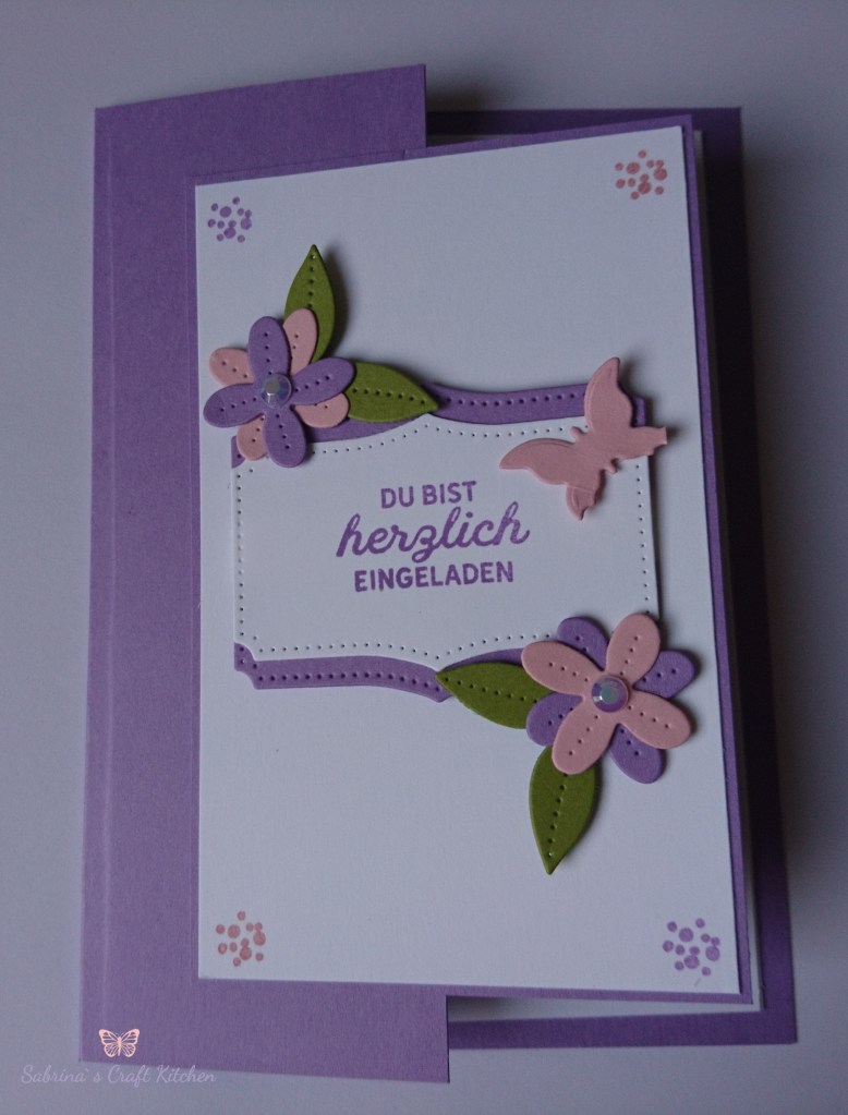 Die Einladungen sind in der Farbe Heideblüte und Grundweiß, die Blumen in Heideblüte und Kirschblüte, die Blätter in Farngrün und die Etiketten in sind mit den Stanzformen Perforierte Blumen ausgestanzt, der Schmetterling ist eine no Name Stanzform.