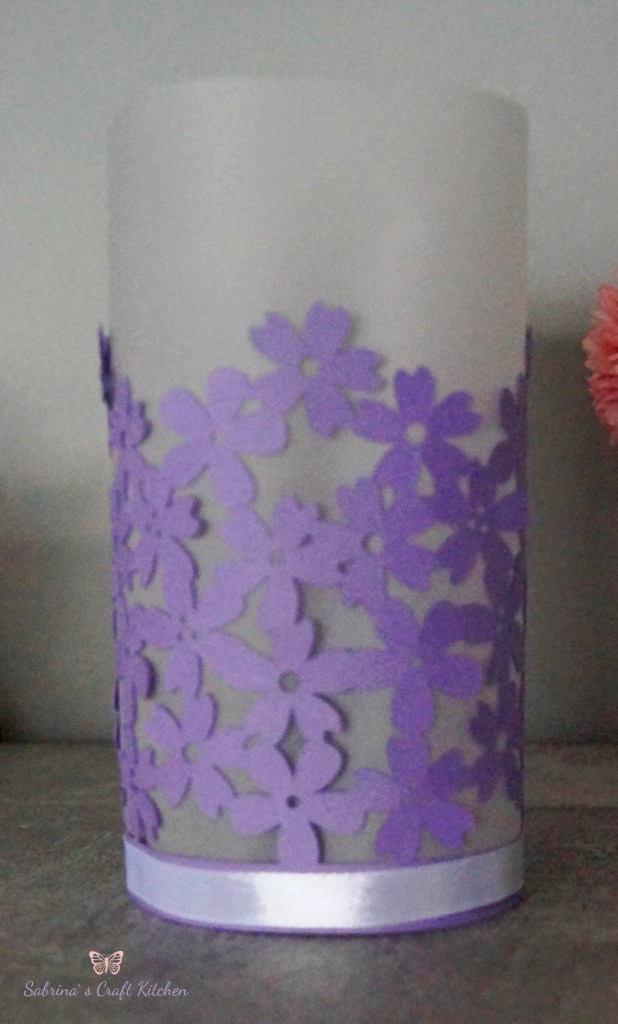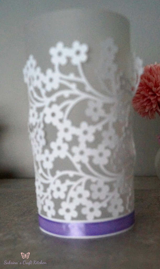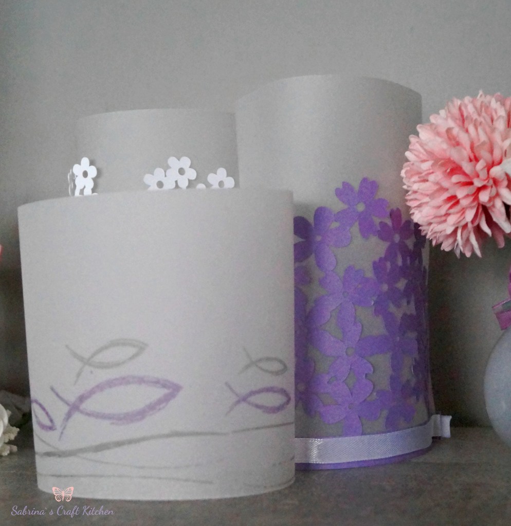 Die Windlichter mit den Blumen habe ich aus Farbkarton Heideblüte und Grundweiß mit dem Plotter ausgeschnitten und mit Pergamentpapier hinterlegt, unten habe ich die Windlichter noch mit einem Satinband in Lila und Weiß umrandet, das andere Windlicht ist in Heideblüte und Schiefergrau mit Fischen aus dem Stempelset Christliche Feste von Viva Decor gestempelt auf Pergamentpapier.