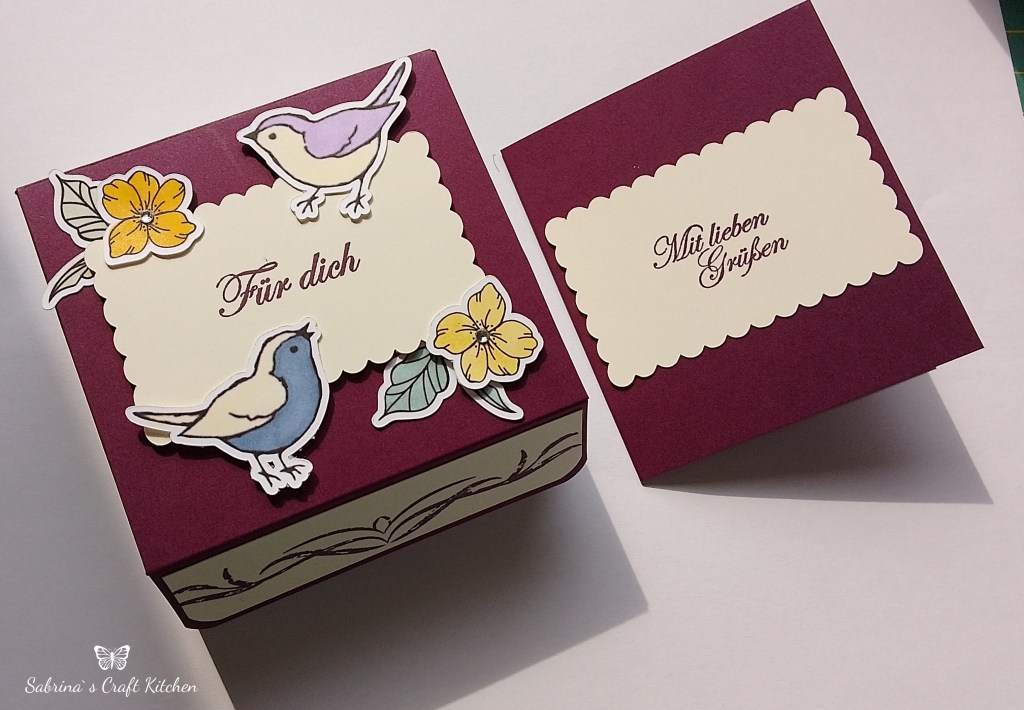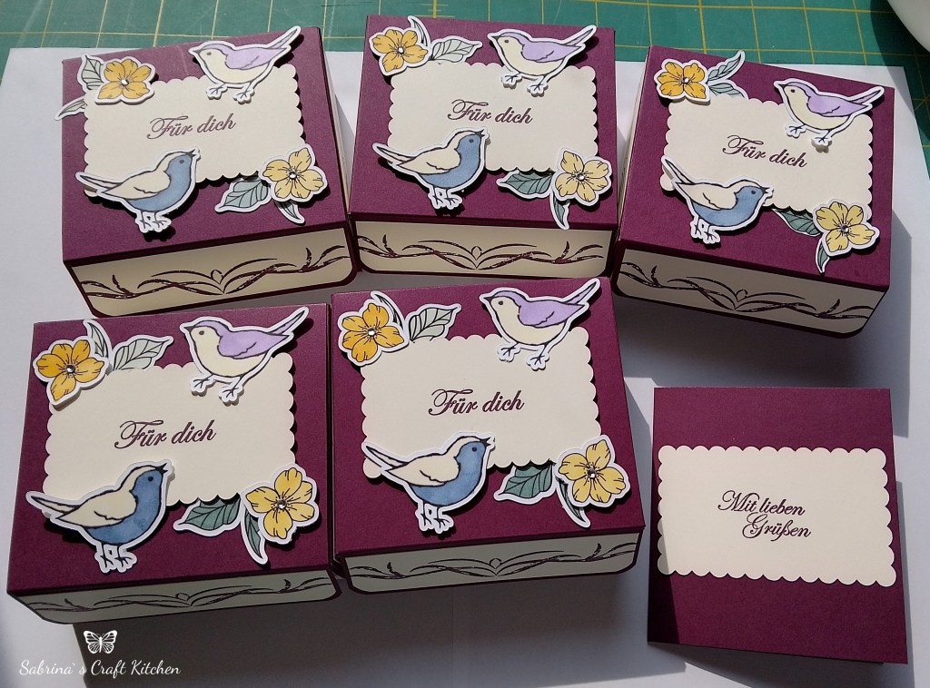 Zu dem Auftrag von den Umschlagkarten, kam noch die Anfrage, ob ich 5 Geschenkboxen in der Farbe Brombeermousse fertigen könnte mit Blümchen und Vögel.