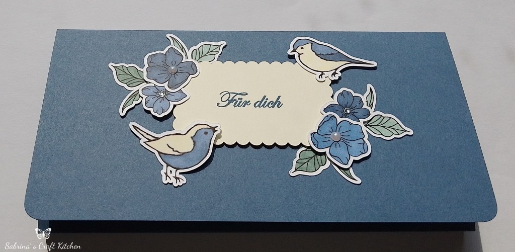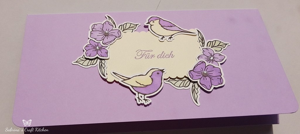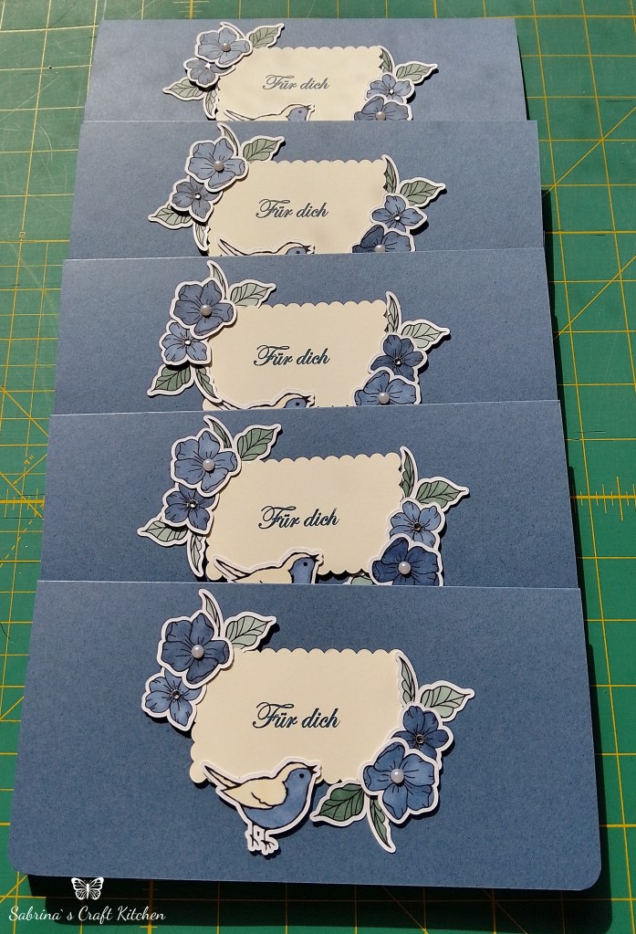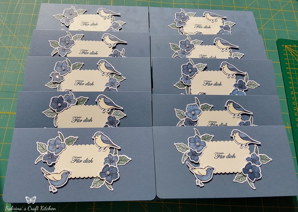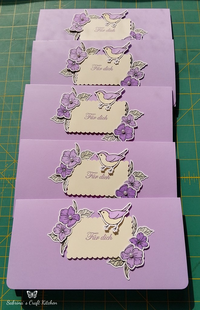 Ich sollte Ihr 30 Umschlagkarten herstellen in den Farben Freesien Lila und Abendblau, mit Blümchen und Vögel, für Ihre Kunden.
